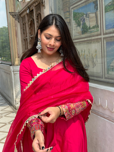 Red Bandhej Anarkali Suit Set