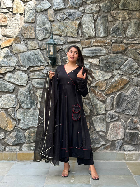 काले स्व-कढ़ाई लक्जरी सूट सेट