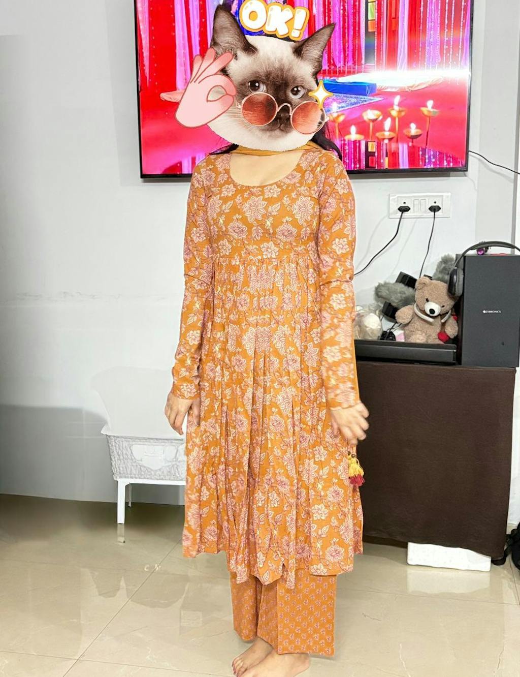 Add a burst of festive charm with the Joyful Mustard Gher Suit Set, crafted from 100% pure cotton for comfort and style. This full-sleeved round-neck suit features a vibrant mustard base adorned with delicate gher patterns, perfect for weddings, family gatherings, or daytime celebrations.